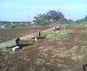 気化した燃料の爆発防止の為の排気管が、丘陵地帯の畑の真ん中から斜めに突き出ています。この下に祖末なコンクリート製の燃料庫がある筈なのだが、現在では封印されていて入る事は出来ません。この燃料庫跡近辺には、この他に滑走路跡やら色々な施設跡が見る事が出来ます。